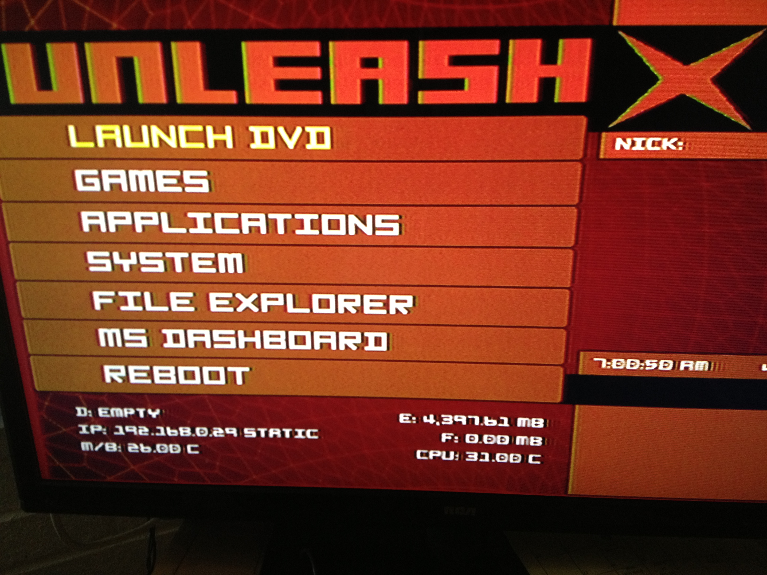 First of all thanks for the response. And second it good to see that there are still people willing to help with old hardware. Here is the screen I was talking about. This is my first time messing around with an Xbox and am a complete NOOB. My plan for this xbox is as follow first I want to run XBMC and emulators like SNES, NES, N64, and MAME keep that pupply in the living room plus I got a FreeNAS with SMB for the movies.[/img]