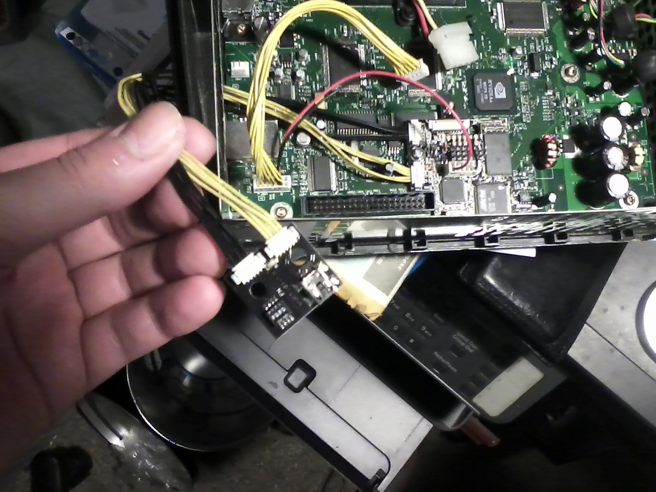 Got this incomplete console from a friend, and found this mod chip installed. It's not soldered on. There's spring-loaded pins which press down on the mobo. There's also a small circuit board with a USB port on it. The same USB port found on many Sony devices, like the PS3 controller. Do any of you know which mod chip this is? Also there was a red 3-way switch that fell out of the console, I'm not sure if it's related or not, it seems to fit in the hole that was cut into the back of the console where the USB port was hanging out. I'm pretty familiar with soft-modding, but hardware mods is uncharted territory for me.