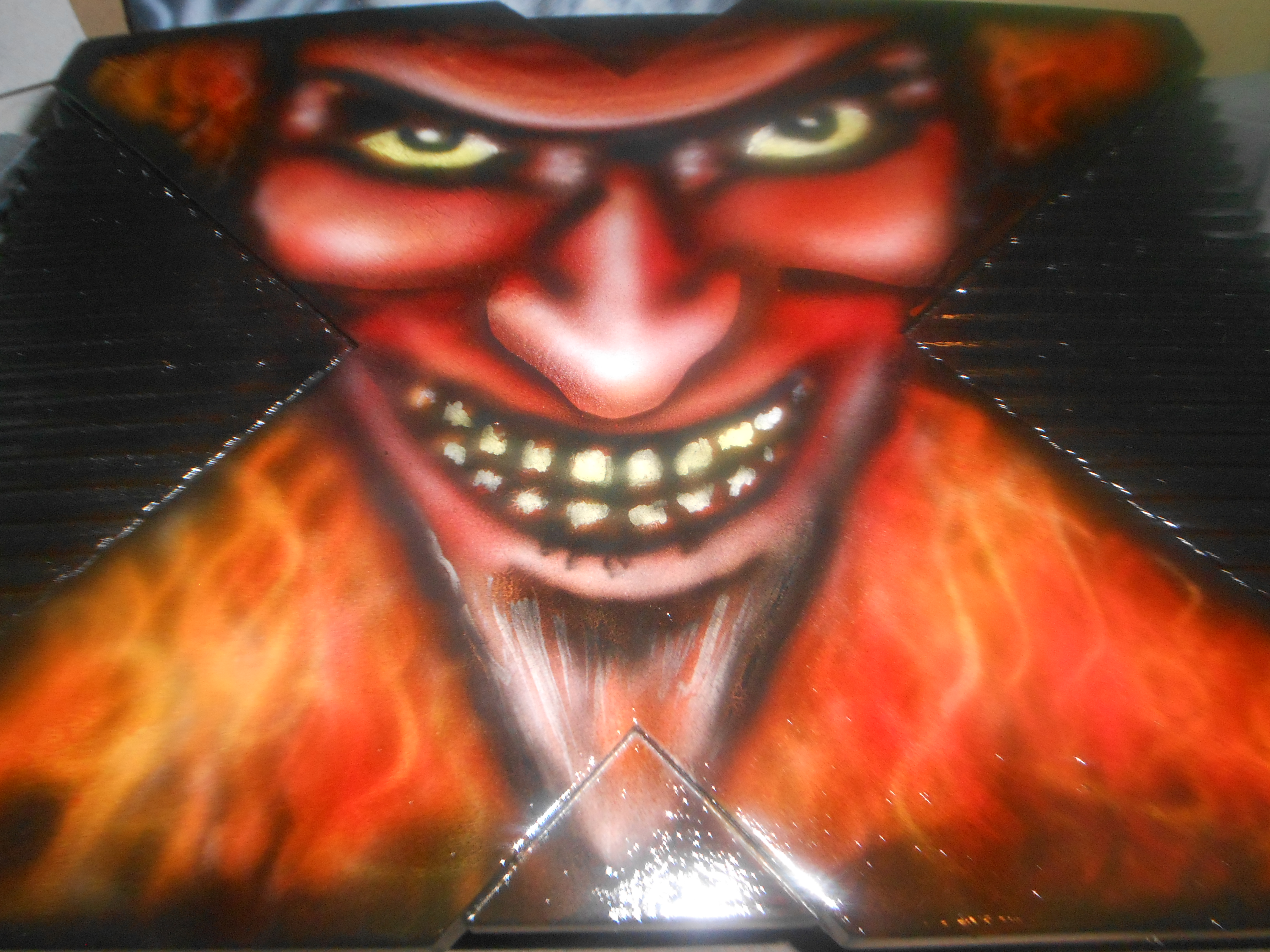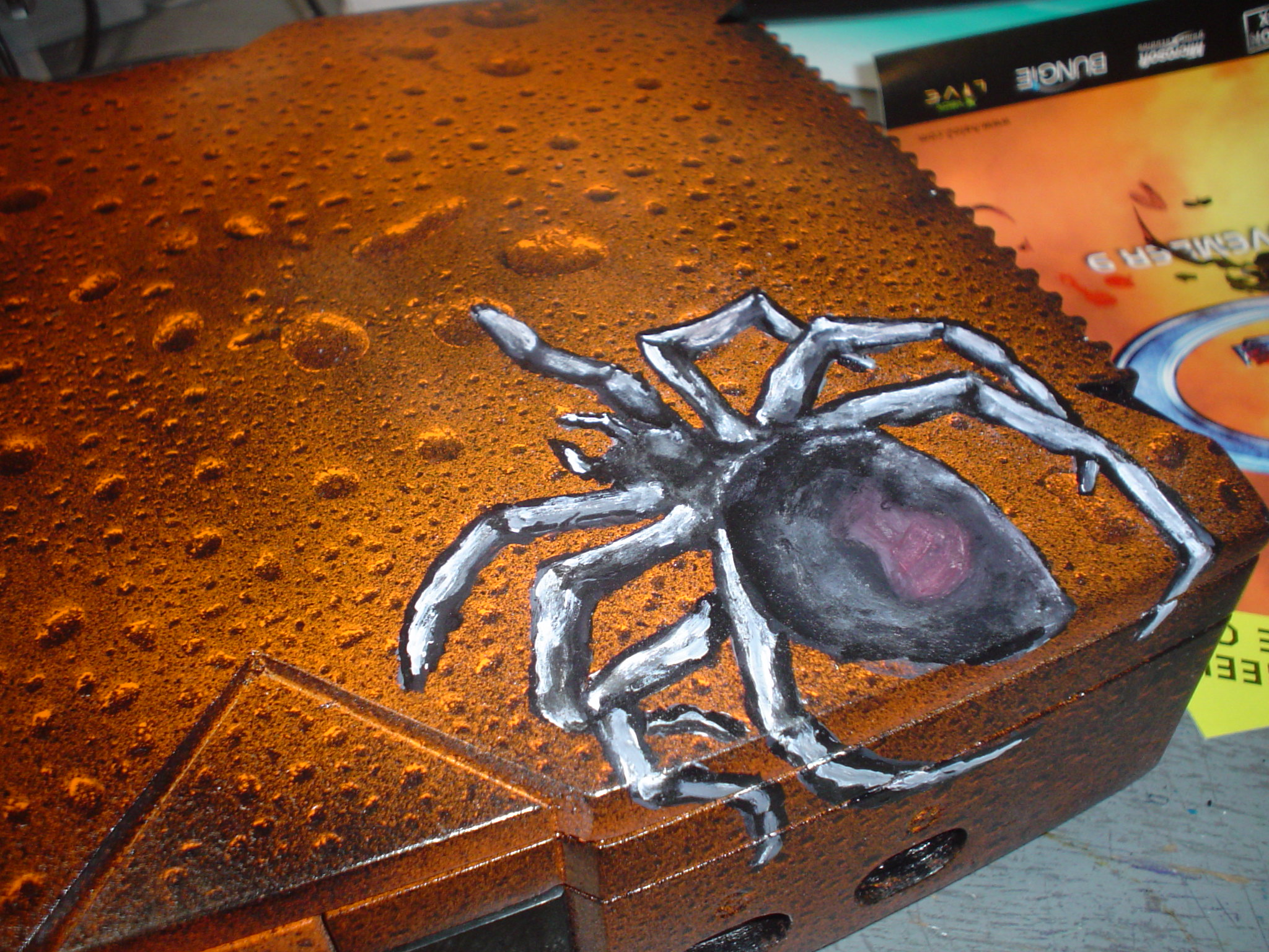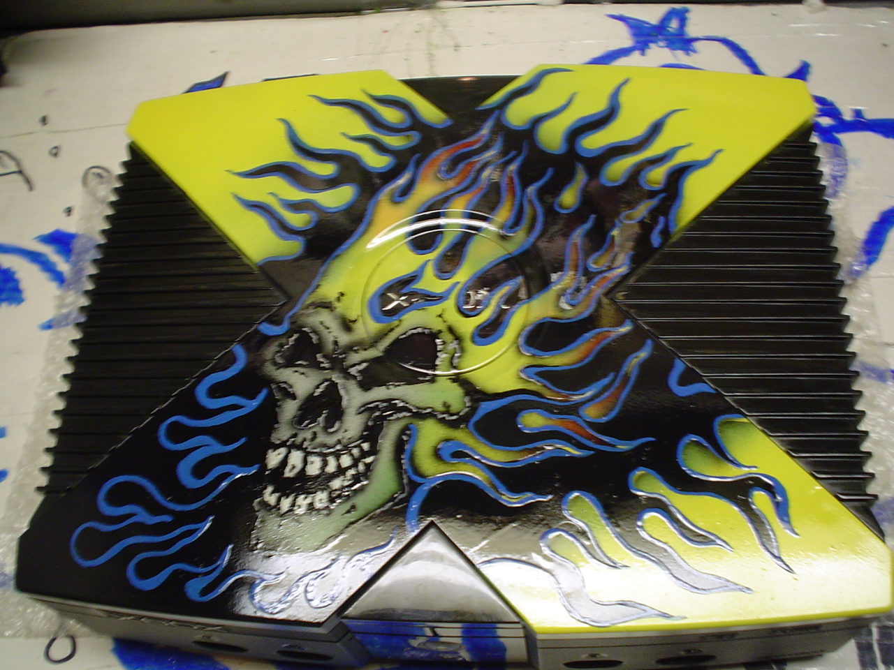 well I really don't have a favorite, there all special to me, all originals never two the same. But the one that really was it for me, and I mean the one that I new I had something wasn't a XBOX it was a PS2. If you could imagine what it was like to make a system for the one person that I worship at the time, comes wanting something that you create. Dave Mustaine of MEGADETH! Let's face it the man can have whatever he wants, and he wants my work! Dam pretty cool. Now this wasn't just a airbrush painting it was all hand carved from one piece of teflon , the chains , skull all of it one single piece, one crack all is lost, the painted. Yep this made me, I can do this line of work.....thank you