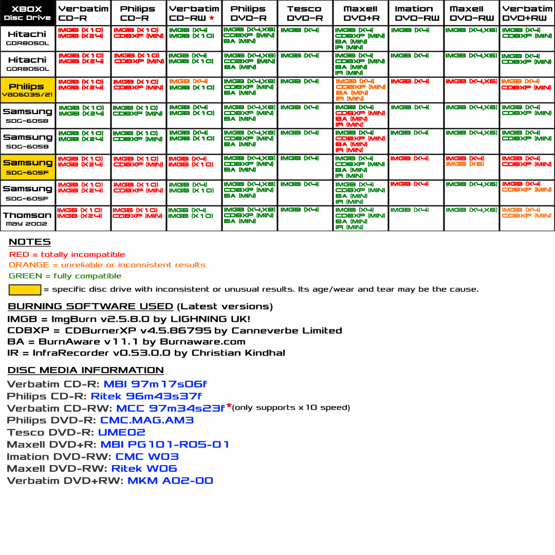 The problem with that second disc drive compatibility list is that it doesn't distinguish between the two different Samsung drives. The 605Bs, in my tests, were compatible with everything even DVD+R. But, as you can see from the results, that was only test where the burning program used seemed to matter ie. ImgBurn.