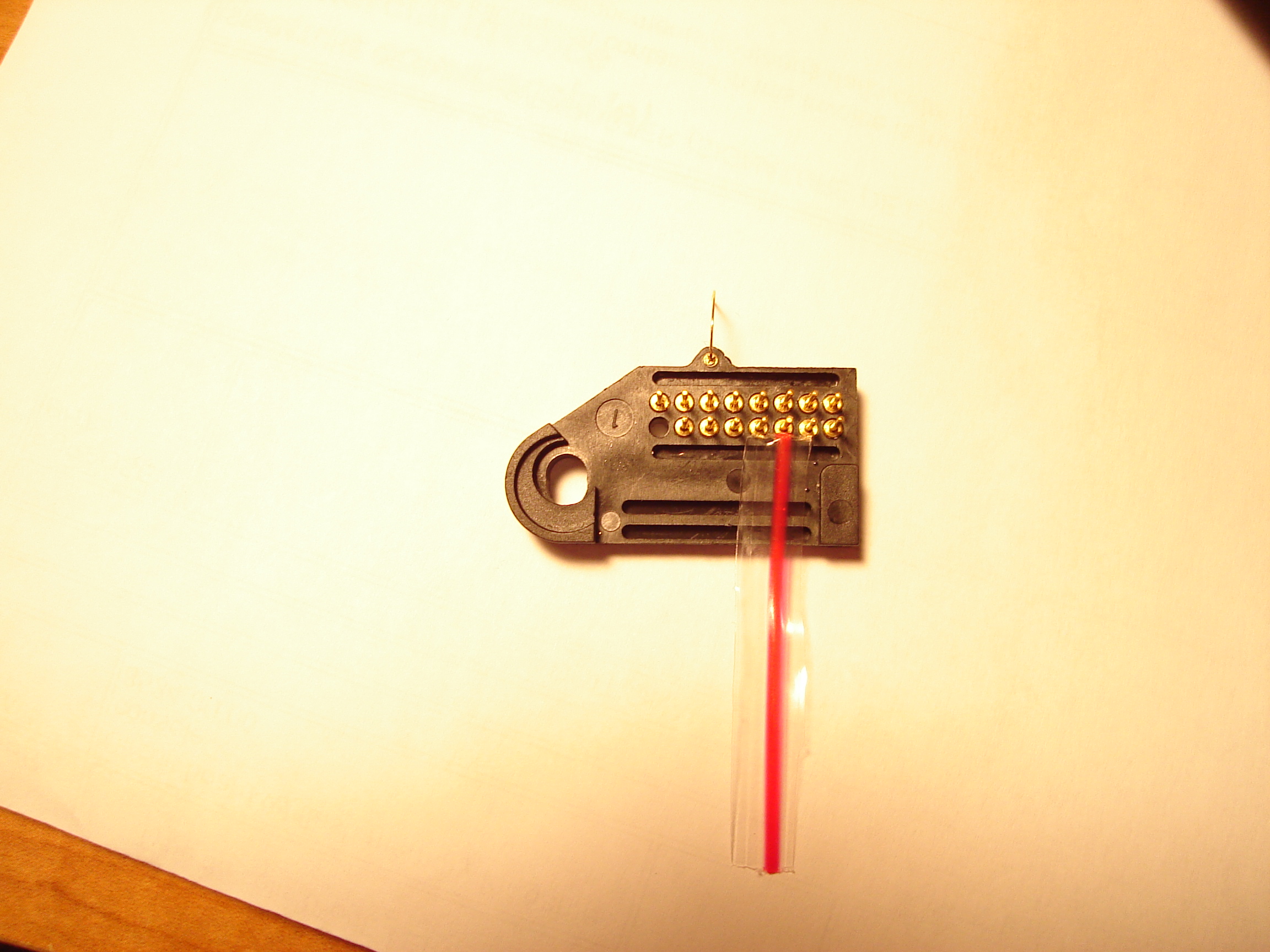 look at the row where one pin is missing at the top, then count down 5 and remove that pin, in other words the pin, on the left, one up from the bottom, (the top is where the screw is)