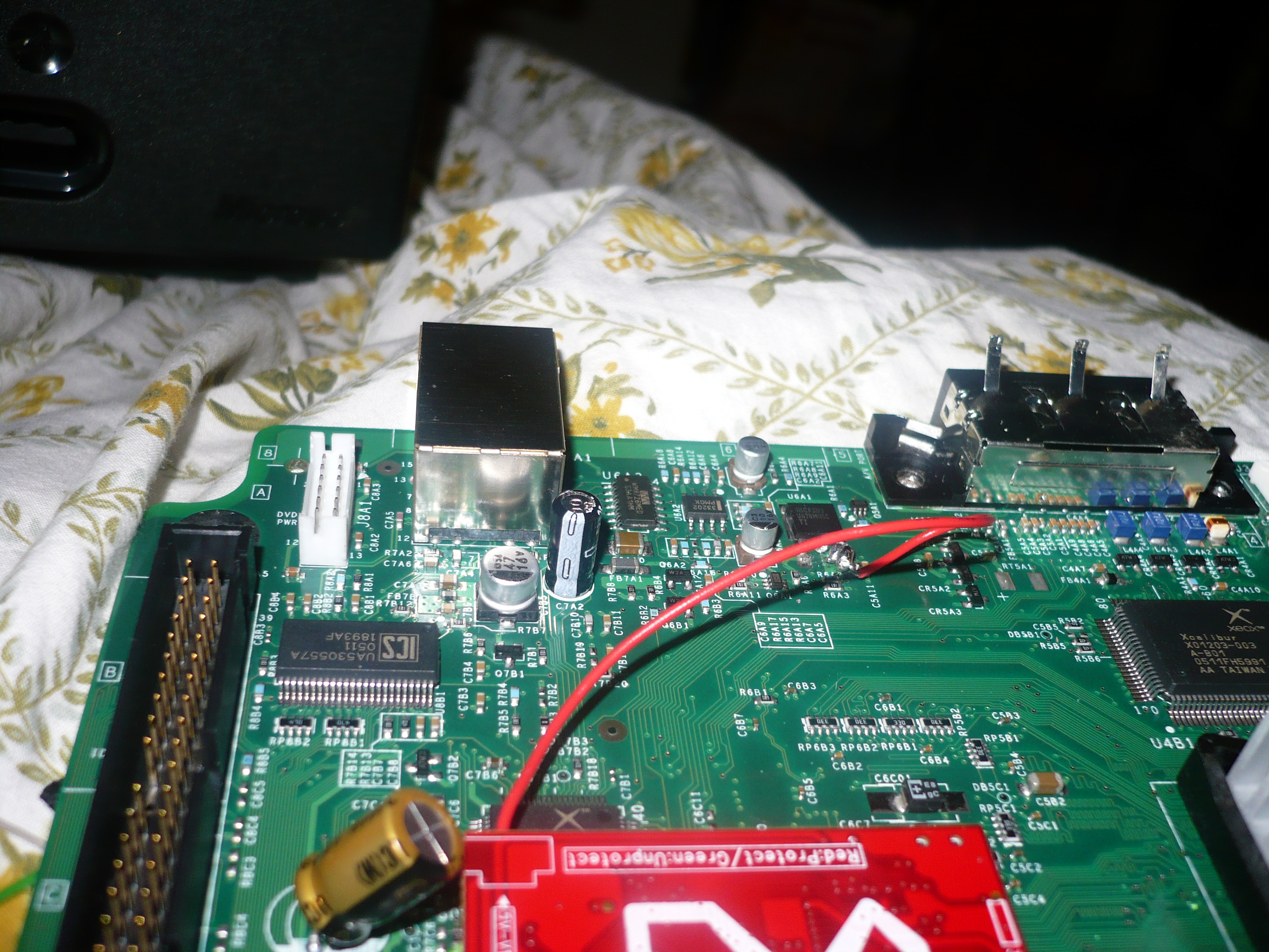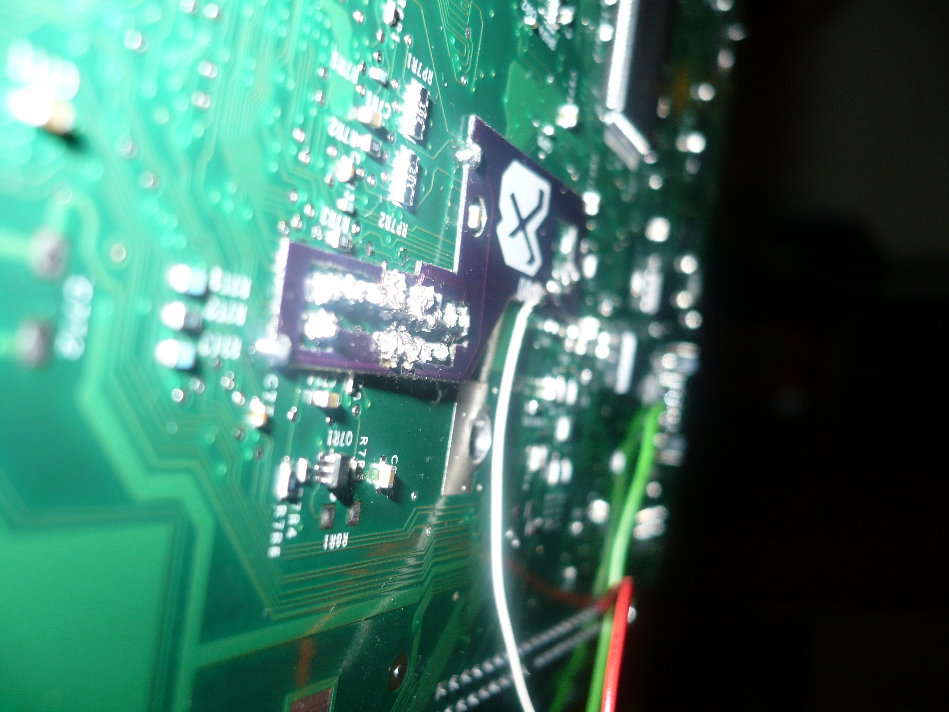 im back thought i was coming back saying success but not yet >< well i de soldered and soldered back. i was done in about 10 15 mins when the first try it took a few hours,soldering i never placed the iron for too long just about a second or 2 enough for the solder to melt that i would place the wires etc. now the xbox turns on i almost exploded on my self i was so happy it went to the dash i turned it off to continue today now today my luck went south it still turns on and depending what bank its on it just might flash orange or green and red or just flash green itll just boot to the ms dash mostly the ms dash and thats it . on the switch itll usualy go red meaning disabled sometimes the hdd will light up blue n more rarely the lan will go orange or something.ive tried a bunch of combos with the banks tapping the power button quickly pushing power and eject nothing it wont go to flash bios and sometimes like i said itll flash a color now i was reading and it seemed a few people had almost the same prob but diffrent outcome 1 person had to solder a little better spreading more and another had possibly a bad chip so im not sure whats going on with mine,i just opened it up i re did the 5v cuz it came loose so now no more erros but no flash it just goes str8 to the ms dash and i dont even think its lighting up disabled or anything. im goin to once again put up some pics and see if anyone could help id really appreciate it but right now i think its either my soldering or the chip dont know everything turns on even the chip when i peek in it lights up blue inside but nothing going on other than that [img]http://www.fileden.com/files/2006/6/25/88727/P1000471.JPG