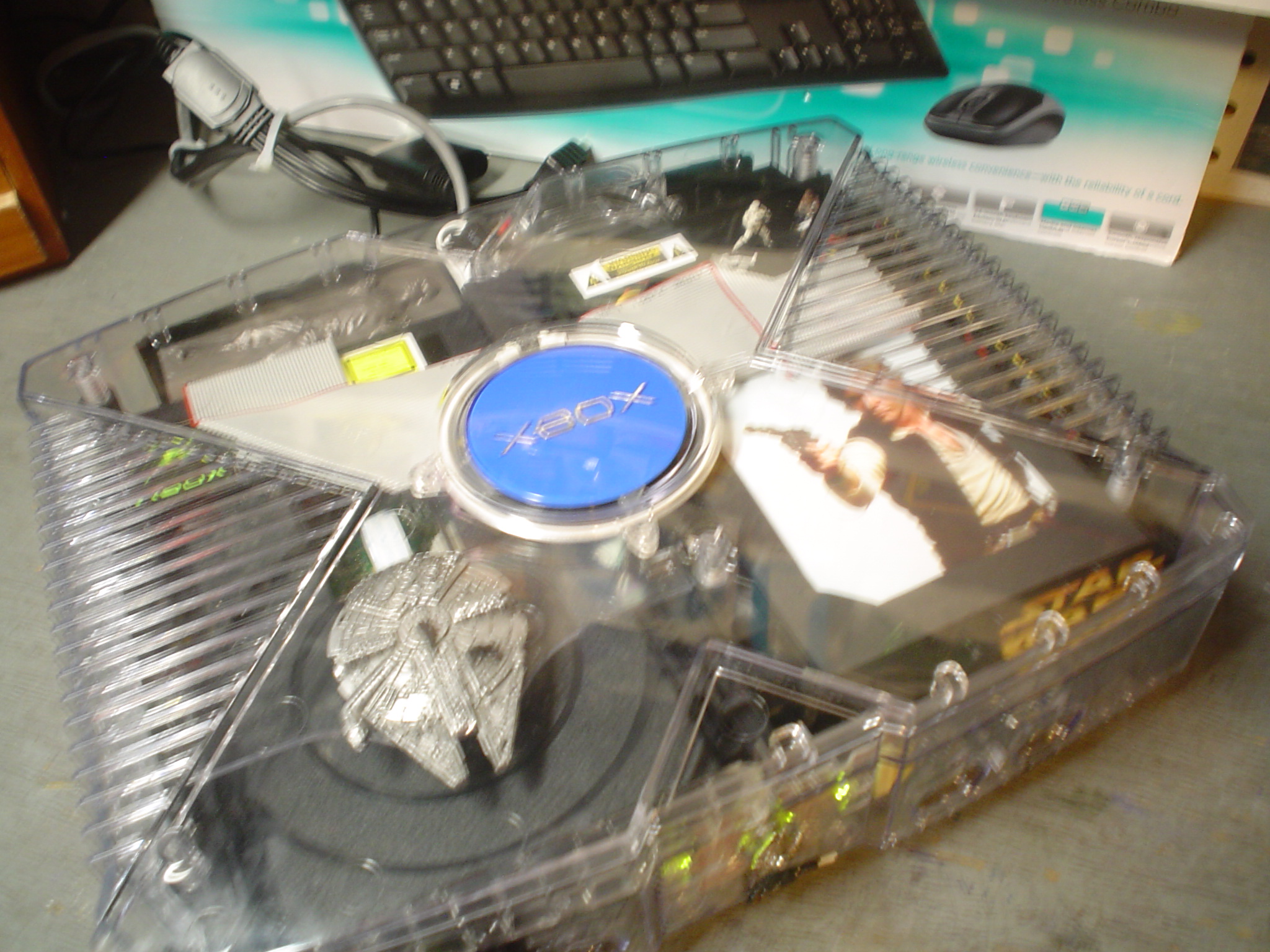 This was made for my son the real and only Kidd New G we made together. I put the airbrush down and I still used his idea a Han Solo theme. It has the fastest ship in the galaxy the Falcon right over where the disc spins kind of gives it a flying look, and when you push the eject button that is also a mini Falcon the disc ejects and shows asteroids underneath. The power button is Hans blaster. A picture of Han is a cover for the hard drive. Right behind that is a small miniature scene of Han and chewy fighting stormtroopers . Moving to the left a clear over size fan the Han frozen in Canaanite, there's more little things but the koolest thing was it was Kidds idea and vision that I help become a real thing for him to touch and play.....