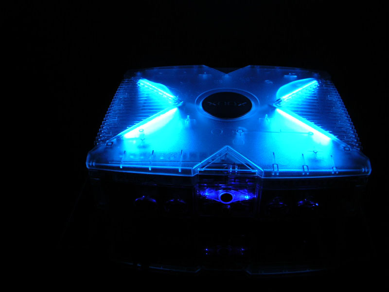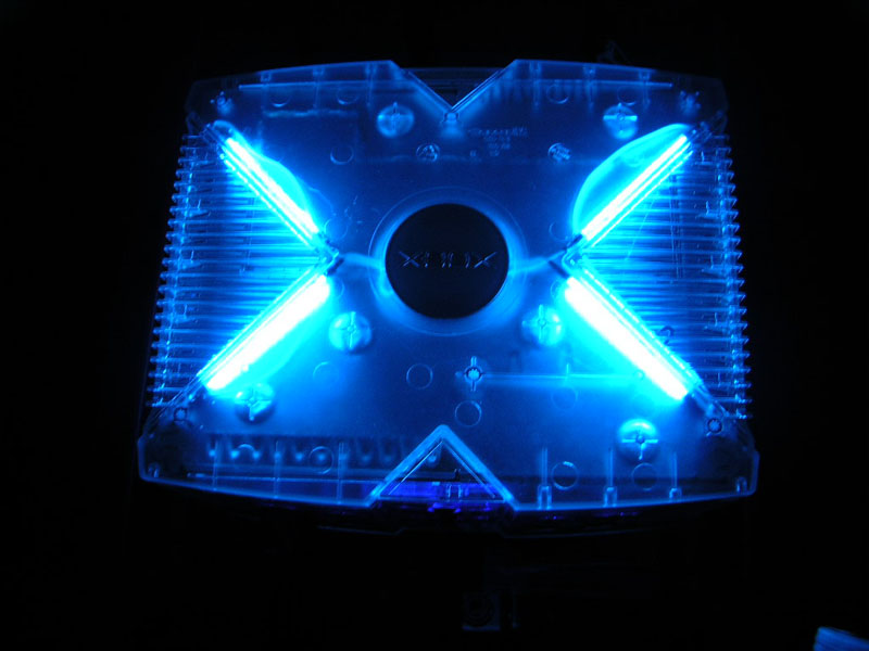 I just finished my little case project and put 4(4inch) CCF lamps on the top of my crystal case. This Xbox is a version 1.3( also have 1.0) but I updated the stock case with the M-soft crystal case.... I removed the shielding and hotglued them to the top, cut away the perforation, ran the wires through the hole on the shielding, and then I connected the cables to 2 inverters I mounted inside the case near the case fan.. I decieded to go with the lamps instead of a jewel ring with this case. let me know what you guys think?? Later Guys