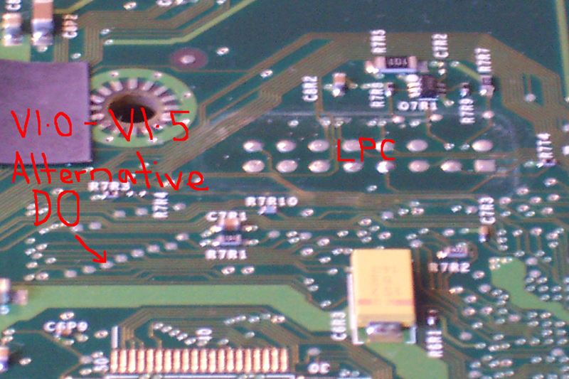 On v1.0 - v1.5, There is an alternative D0 point on the underside which I always use and I think is easier to solder to. Then I feed the D0 wire and the Hdd wire (L2) through the unsoldered holes in the LPC and up onto the chip - very tidy! - I have included a pic of the point but you can double check this point is connected to the usual D0 point with a multimeter.