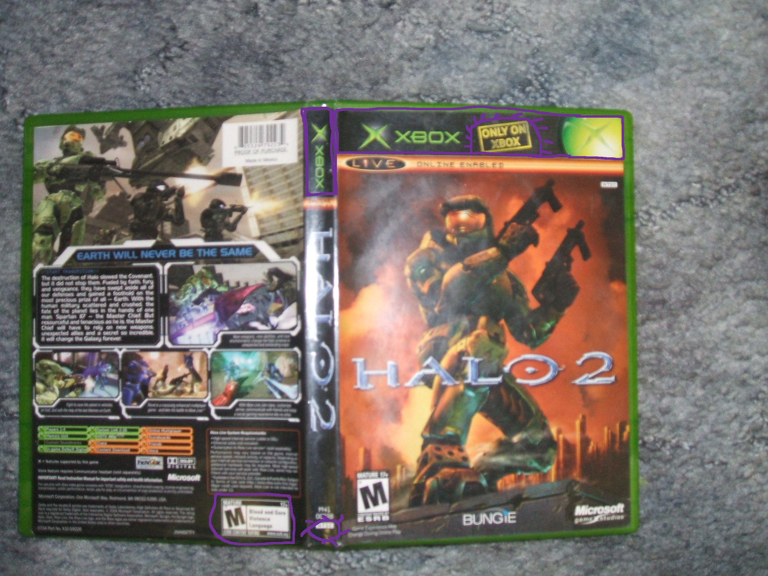 this is how i think you should have the case, everything highlighted in purple with some a few changes, like at the bottom where it is ntsc in the white box maybe have ntsc and then pal in another white box below it, where the ESRB crap is maybe put rated H and then the reasons: hacker, homebrew, useful and then make sure you include the only on xbox part too, and not sure how good you are in photoshop but if you could where it says live online enabled maybe change that to like hacker hombrew included or something like that, just some thoughts and suggestions and i REALLY like that new blue one
