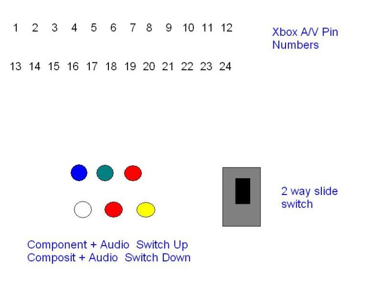If someone could just draw in the lines representing the wires on the 2nd picture from the pin number to the RCA jack and switch it would be greatly appreciated i think I am just over thinking this and could use a little bit of help. My xbox is NTSC North America, I want basic composite, and High Def Component with a simple 2 way slide switch, I dont ever want to you the origanl xbox cable again, in fact i may even desolder the adapter from the mother board if i can figure out what wires go where. Thanks for any and all help, Slayer