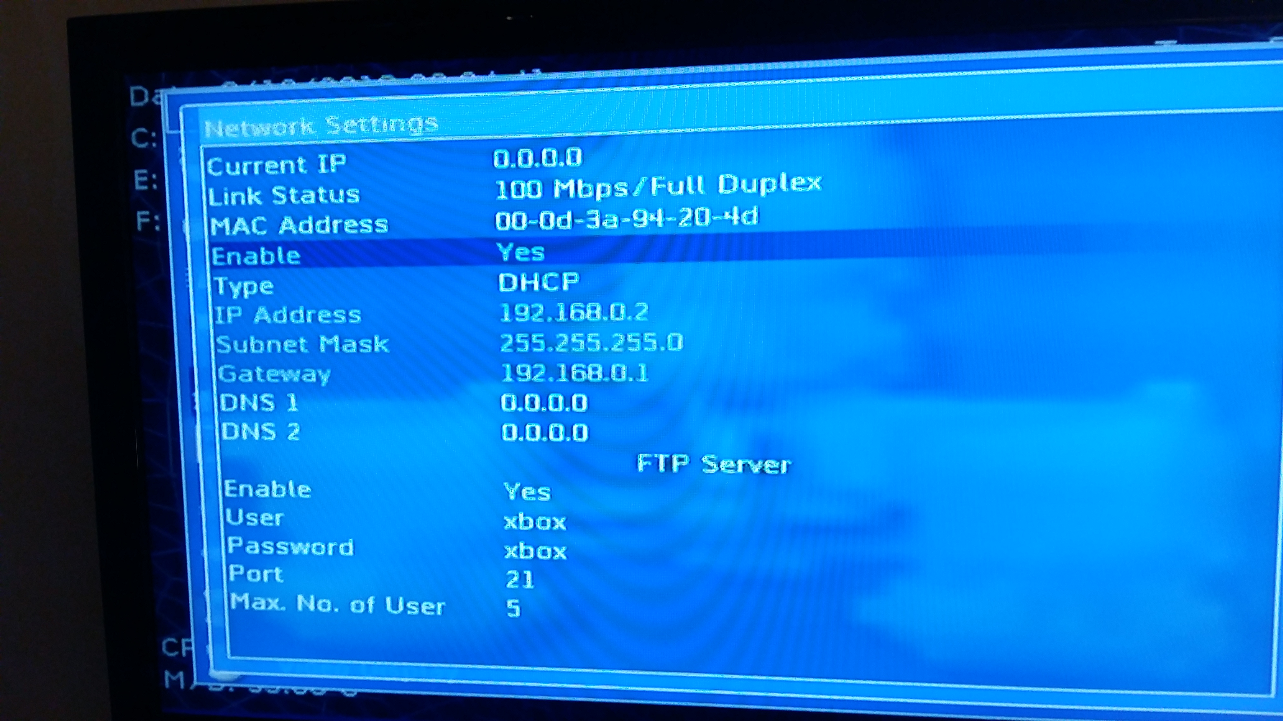 FTP to the STATIC IP address: 192.168.1.253, login userid: xbox, with password: xbox
