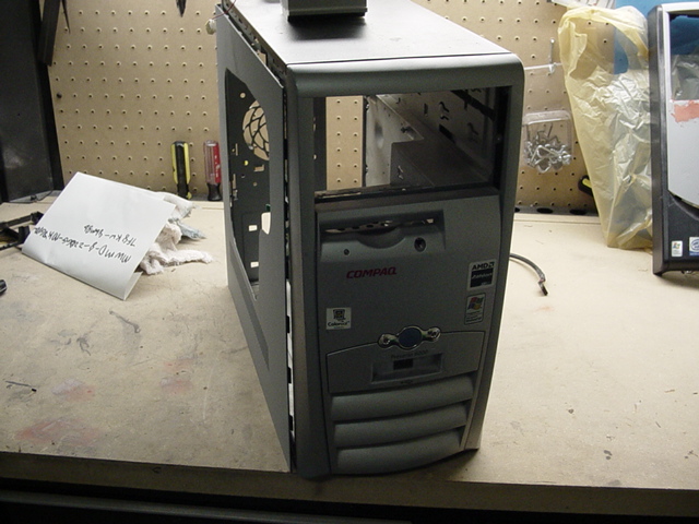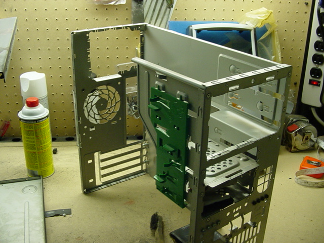 i decided i didnt want the standard computer i/o's for an xbox, so i got rid of the back panel. i picked up a rivet gun while i was at it. those are impressive little tools.