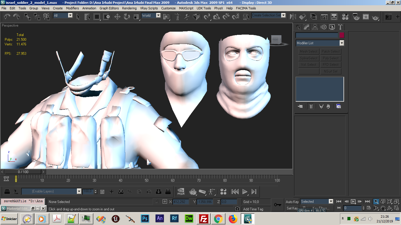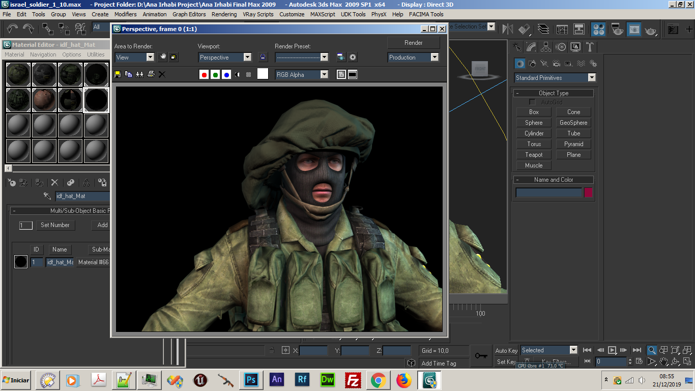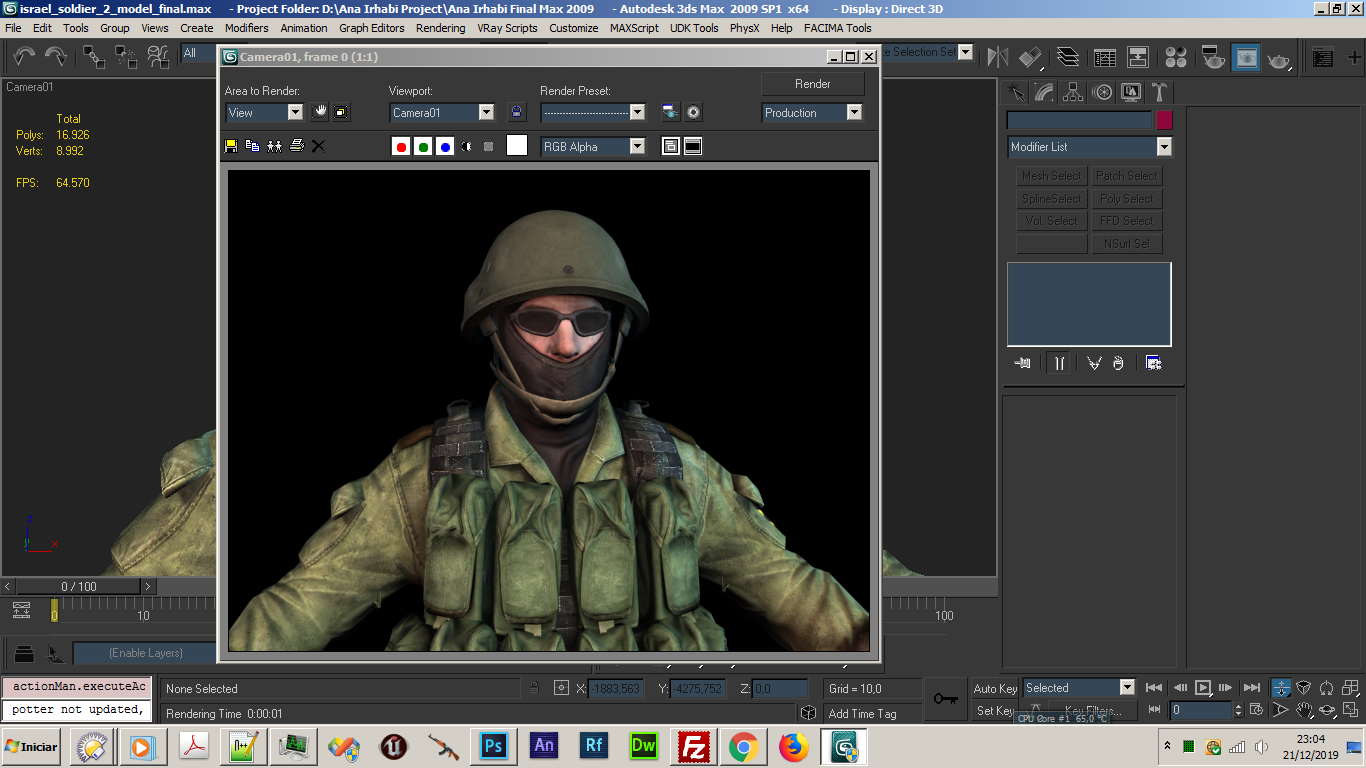 I have done a lot of manual changes on this model, in example, the head cover was untill the neck, however I wanted this headcover to raise down untill the chest, so I manually modelled that extra part to make it reach the chest. Also the original texture was a plain black, so I manually created in Photoshop this Shemagh Texture in red color, the traditional Palestine Head Cover. Also to add some more depth, I did bake some small shadows on the texture to make it look more realistic and give a kind of fake volume to this head cover.