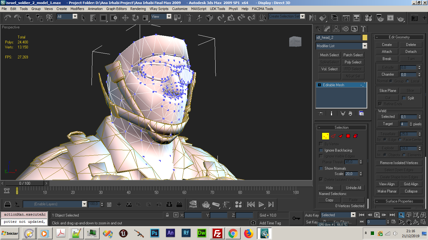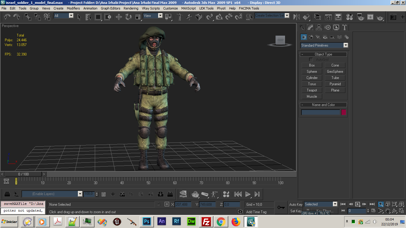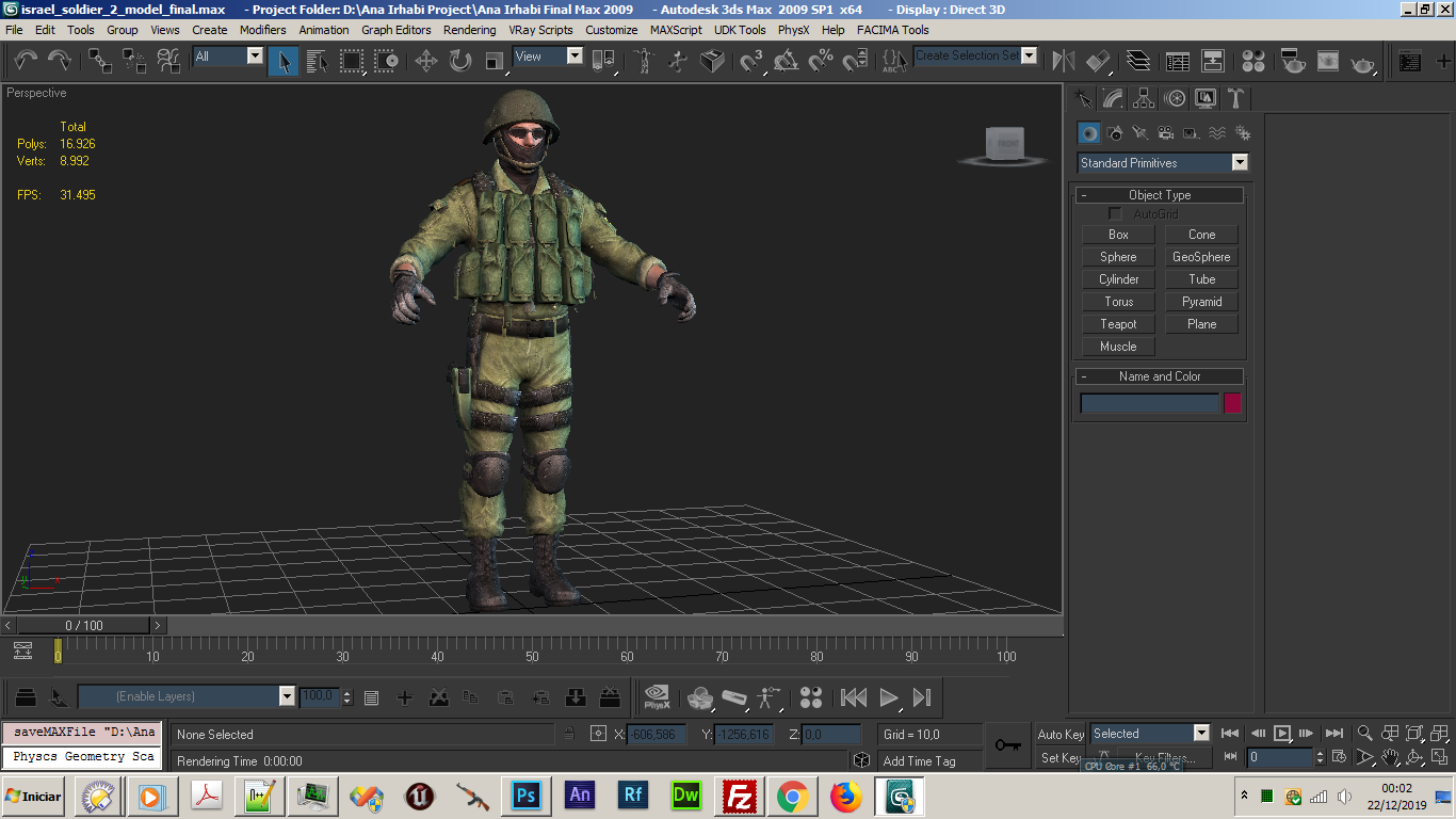 I have done a lot of manual changes on this model, in example, the head cover was untill the neck, however I wanted this headcover to raise down untill the chest, so I manually modelled that extra part to make it reach the chest. Also the original texture was a plain black, so I manually created in Photoshop this Shemagh Texture in red color, the traditional Palestine Head Cover. Also to add some more depth, I did bake some small shadows on the texture to make it look more realistic and give a kind of fake volume to this head cover.