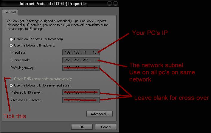 Lets get you sorted! Ok for a start I have a router (not cross-over).. Things were pritty simple and first attempted work for me so i'll do my best to get you running!!