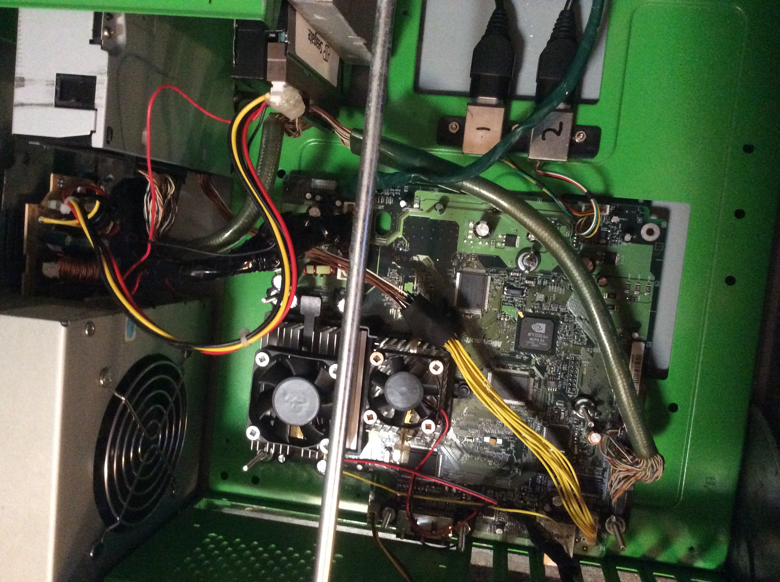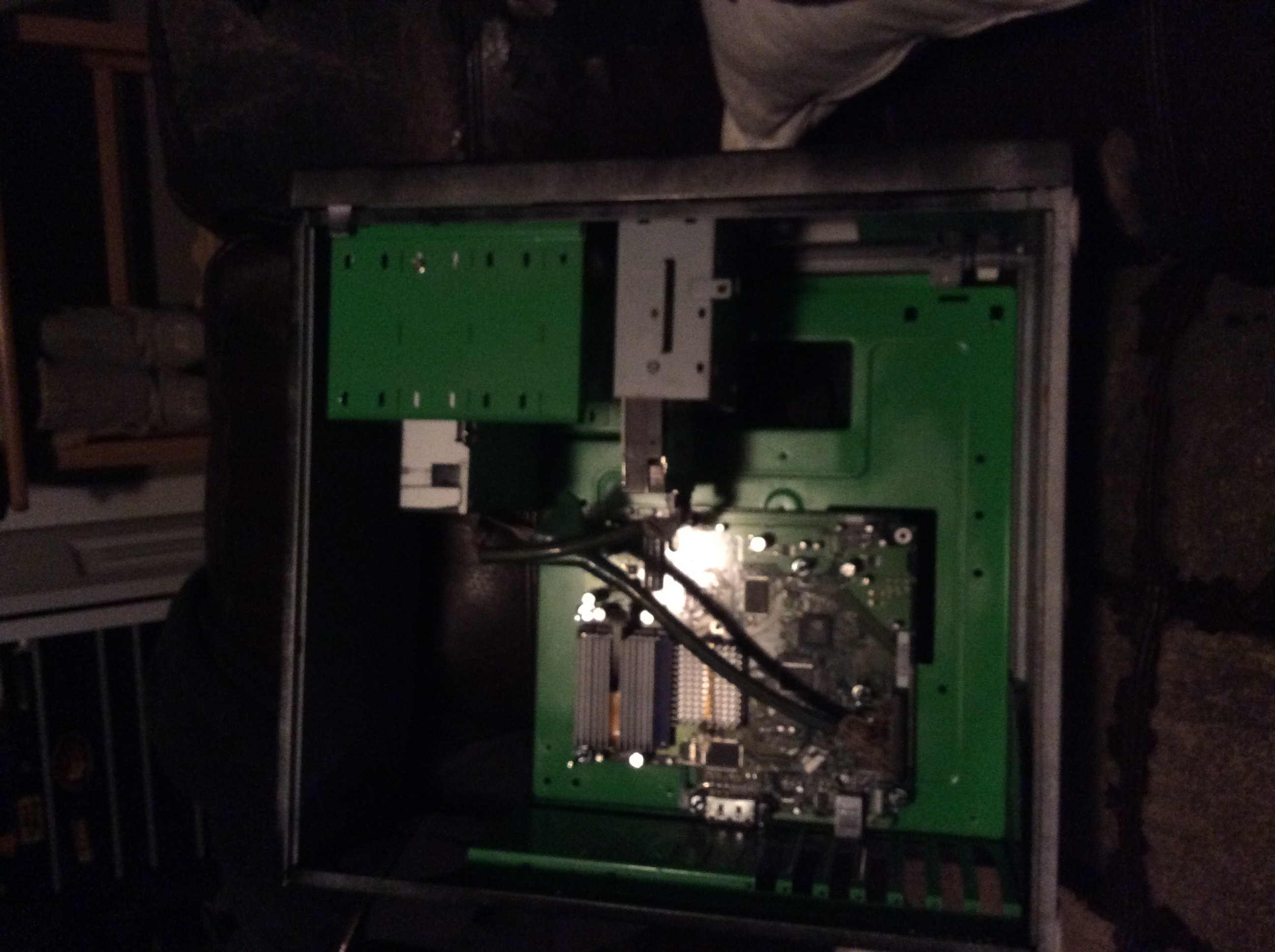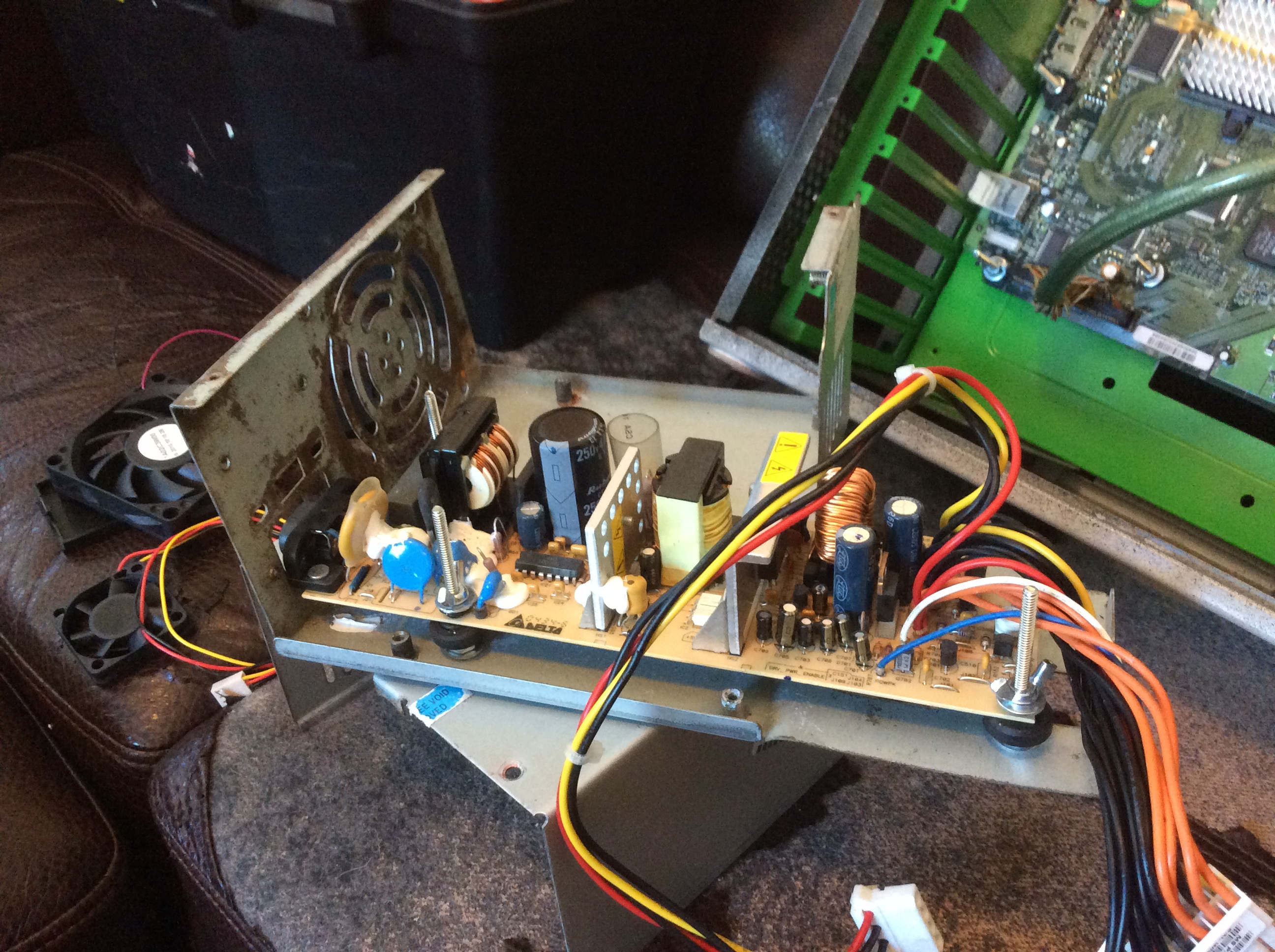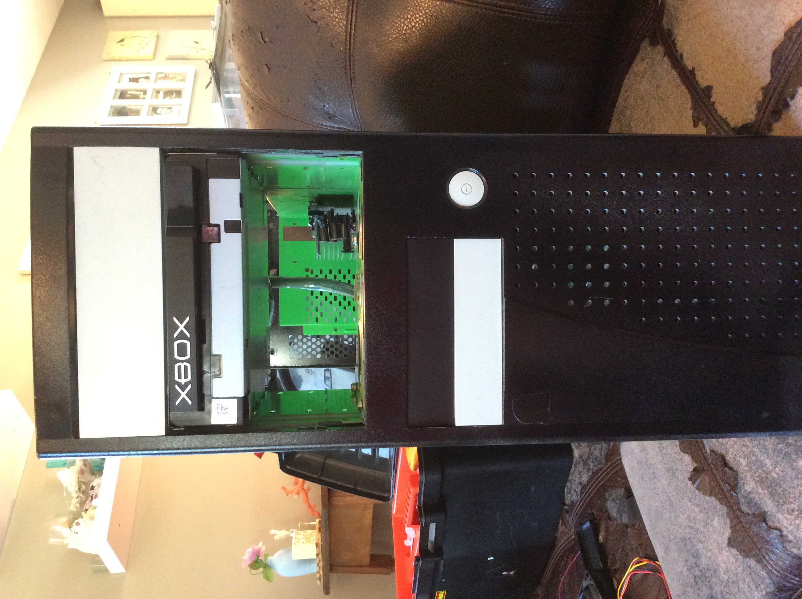 Xbox psu installed inside PC case along side with motherboard, hdd, and dvd drive