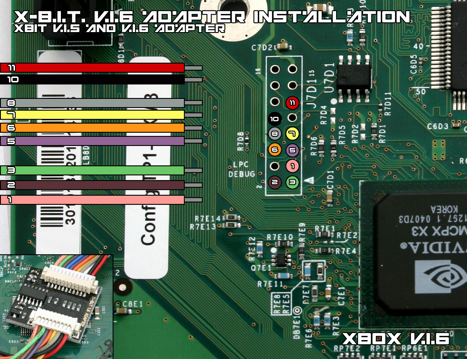 I have installed my xbit into the xbox using the 1.6 adapter i got from dms. The 9 wires (the 1.6 adapter converts 11 wires into 9) have been soldered to the lpc according to the diagram on the dms website (I have attached the diagram).