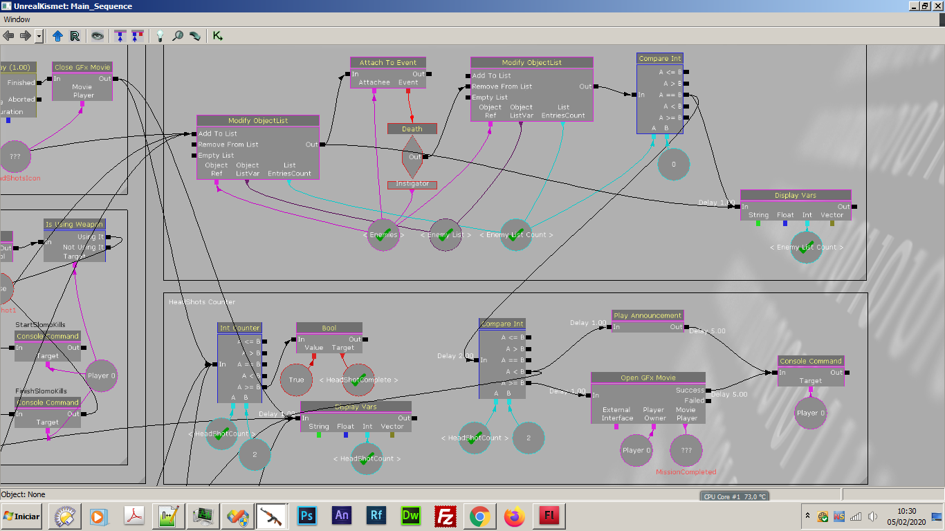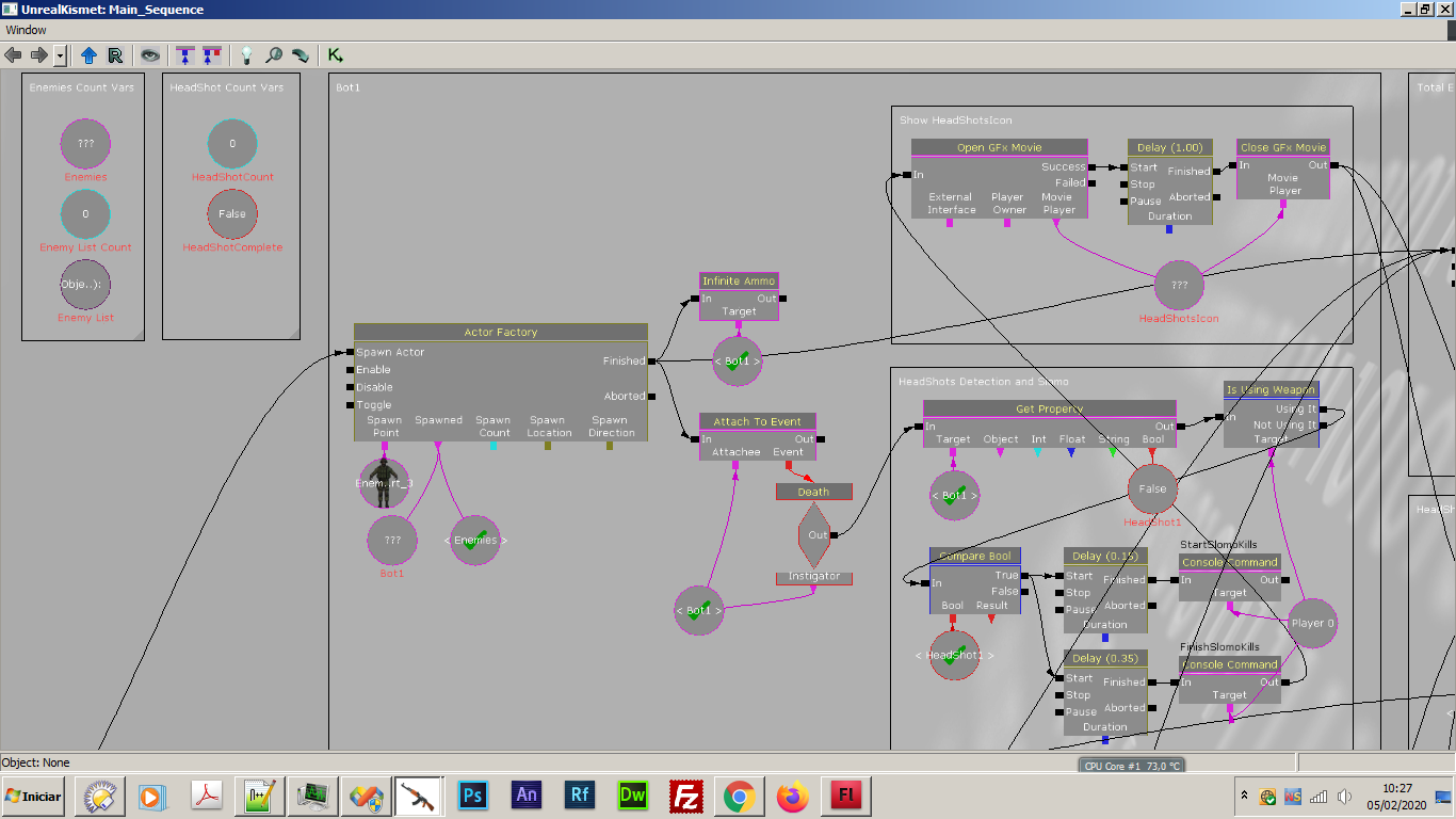 And then on Kismet there is a node which can read object properties (variables). So I simply added this node to read the variable HeadShot value, and if its true, I made increment in 1 another variable (kismet variable) which is the HeadShot Counter. So that means, each time the player shoots the head of the enemy. the HeadShot Counter will increment in one, so the player performs 3 headhsots on the enemy, the HeadShotCounter will be 3.